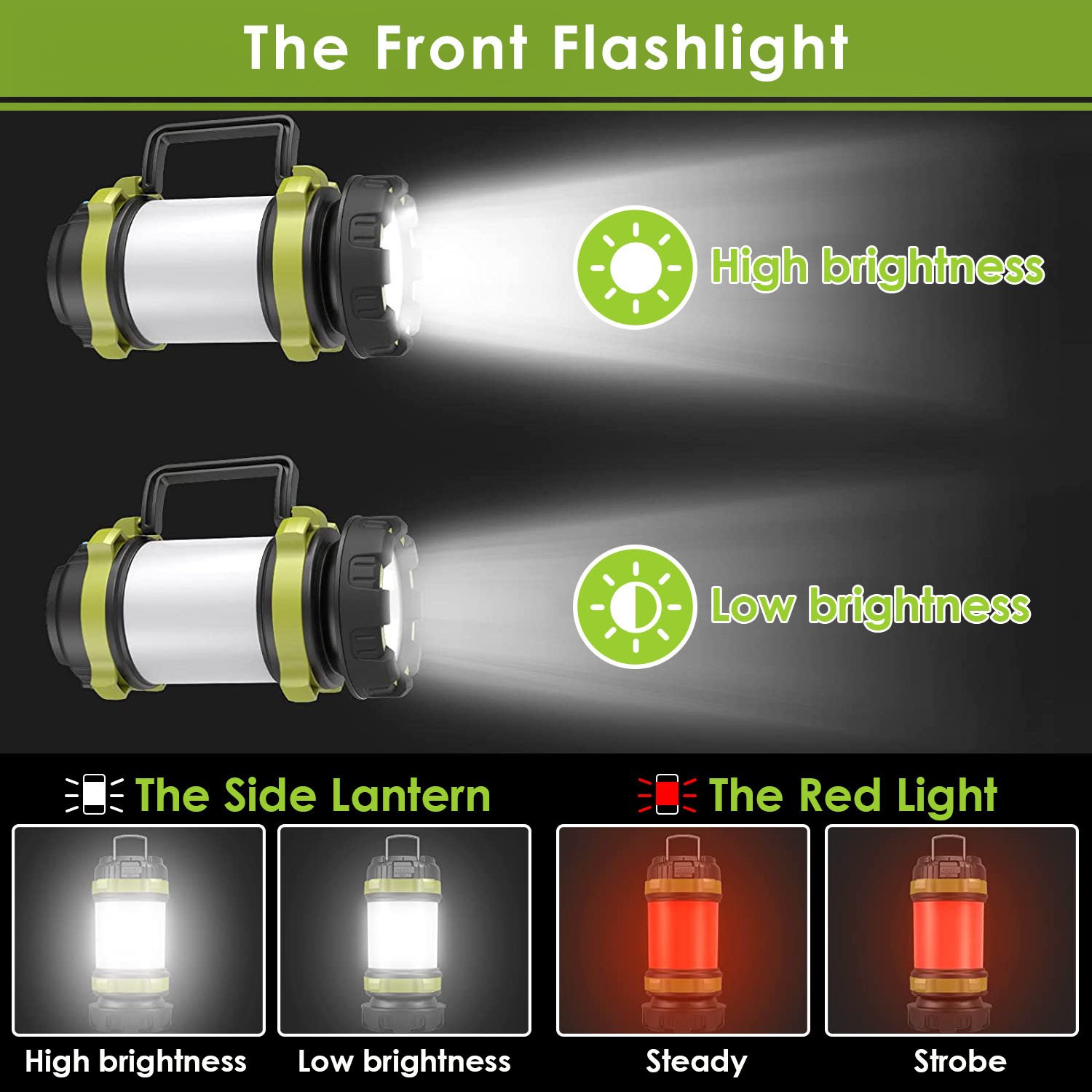 *6 Lighting Modes*:This camping lantern is equipped with 6 light modes; including high/low modes flashlight & lantern with extra red light(steady/strobe). Short press the switch button to cycle through various modes and meet diverse lighting requirements throughout the campsite. The lantern & flashlight is perfect for outdoor illumination or searching while the red light can be life savers in emergency.