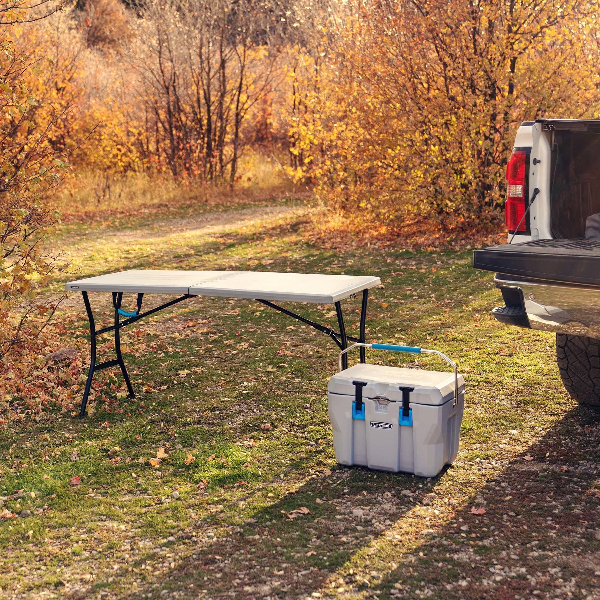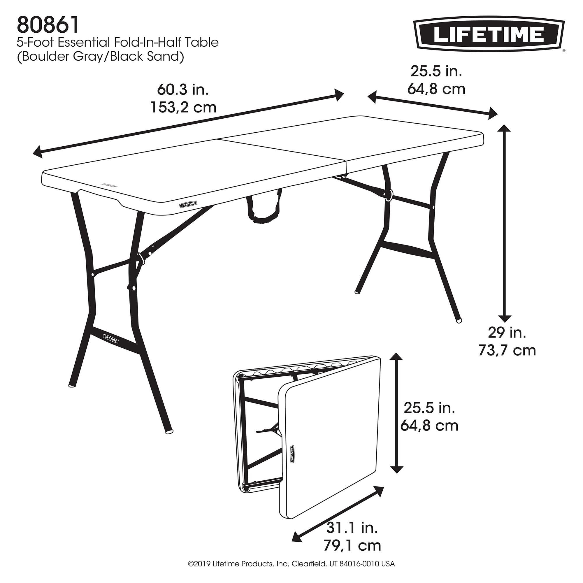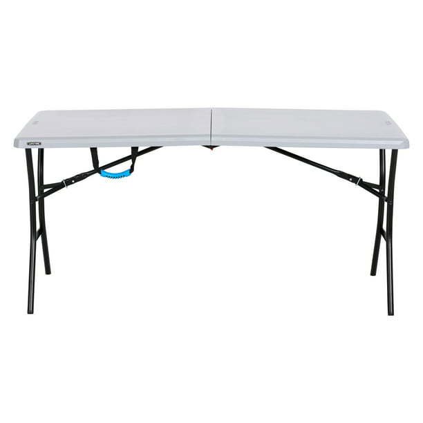 5-Foot Fold-In-Half Table is the perfect pair for your Cooler. Whether you are roughing it on a camping trip or out tailgating with your friends and family, this table is the site for food and drinks. This table is part of the rugged line up and features a compact fold-in-half design and handles that makes it ideal for outdoor excursions. UV-protection, weather resistance, and stain resistance equips the table for heavy use. The impact-resistant edges and corners protect the table from damage so the table maintains its look and utility. The steel frame provides a sturdy foundation that is powder-coated with a weather-resistant finish. 5-Foot Fold-In-Half Table is a great table for game day or any outdoor adventure.
