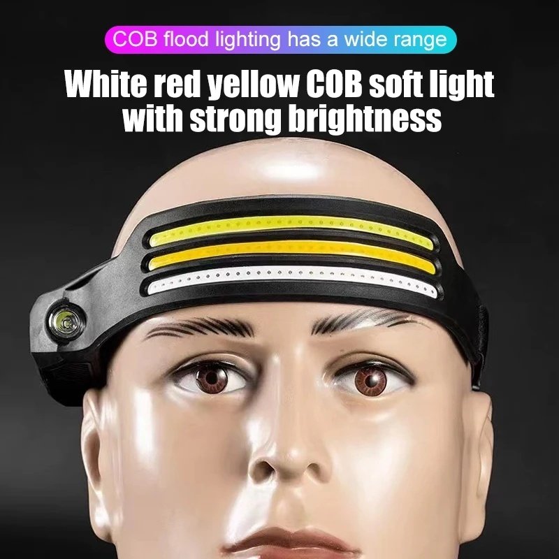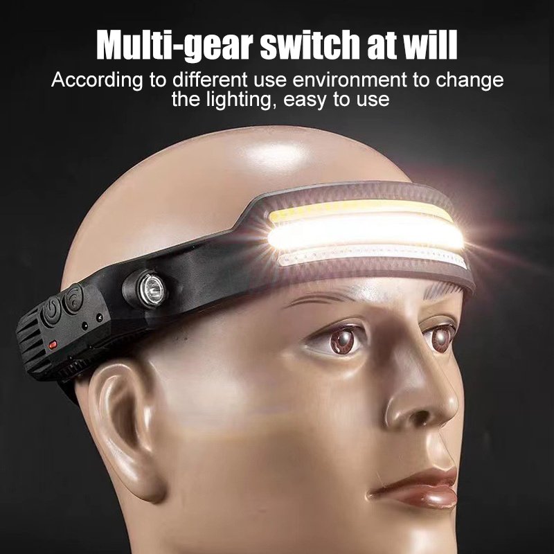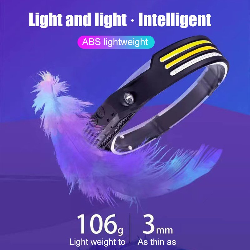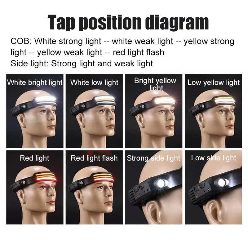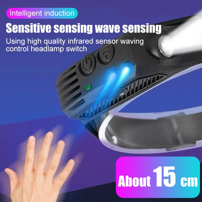 Wide bright beam— 230° wide-angle field of view and 350 lumens suitable for various outdoor scenes.USB charging function— The rechargeable built-in 1200mAh lithium polymer battery .Intelligent sensing technology –– Headlamps are equipped with the latest smart sensors. You can easily control the light on and off by waving your hand.(The induction area is located around the induction switch. When using this function, please turn on the headlamps and the induction switch at the same time)5 Light modes —The led headlamps can meet various lighting needs. It has 5 lighting modes:COB high mode, COB low mode, XPE high mode,XPElow mode, and strobe mode. You can adjust any light mode through the headlight switch. (Note: in any other mode, long-press the power button for 2 seconds to switch the strobe mode, at this time the COB and XPE light flash at the same time)Lightweight & Comfortable –— The headlamp flashlight has an easily adjustable elastic headband and two buckles. Its compact size and IPX4 water resistance are very suitable for running, camping, fishing, and outdoor adventures. (Easily adjusts to hard hats and helmets)
