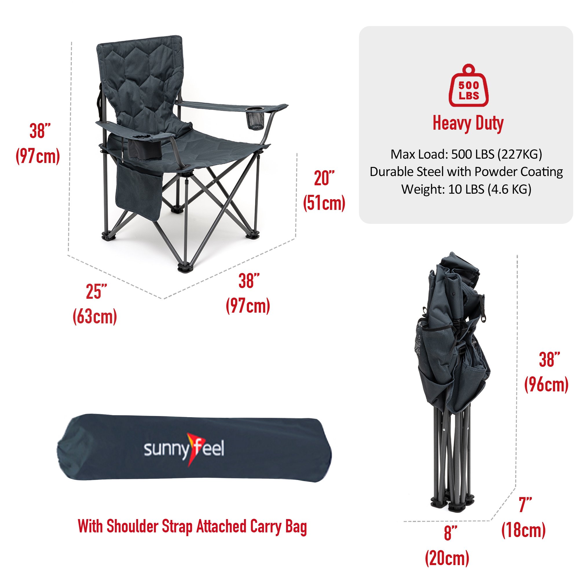 Super Handy: COOLER BAG & CUP HOLDER Keep your beverages cool in this built-in cooler bag(3 cans of cokes capacity). A convenient cup holder is built in to the left arm. The fabric is made from a durable outdoor-quality 600D oxford polyester.Built to Last: The sturdy steel frame construction affords up to 300 LBS (136KG) weight capacity and the chair weights 8.8 LBS (4KG). The double-seam 600x300D Oxford Cloth with 140g Foam Padding has great strength, durability, and breathability. You don't have to worry for the heavy-duty use, either to buy a new one in the near future.