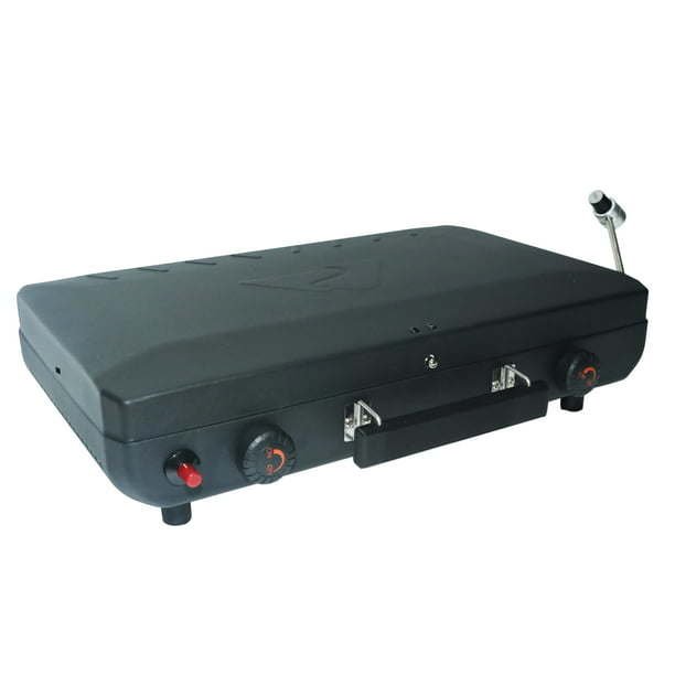 Propane 2-in-1 Portable 2 Burner Grill Camp Stove:2 10,000 BTU stainless steel burners for a total of 20,000 BTUs of cooking power6 inch pot stand and 122-Square inch cast iron grilling areaRemovable grease management tray for easy cleaningBuilt-in wind guards keep the flame strong even during suboptimal weather conditionsPush-button ignition system for matchless lightingPerfect for camping, hunting, tailgating and other outdoor occasionsPowerful design that runs for up to 1 hour with a 16-oz cylinder propane canister sold seperatelyColor:BlackModel No. : GCT2220W