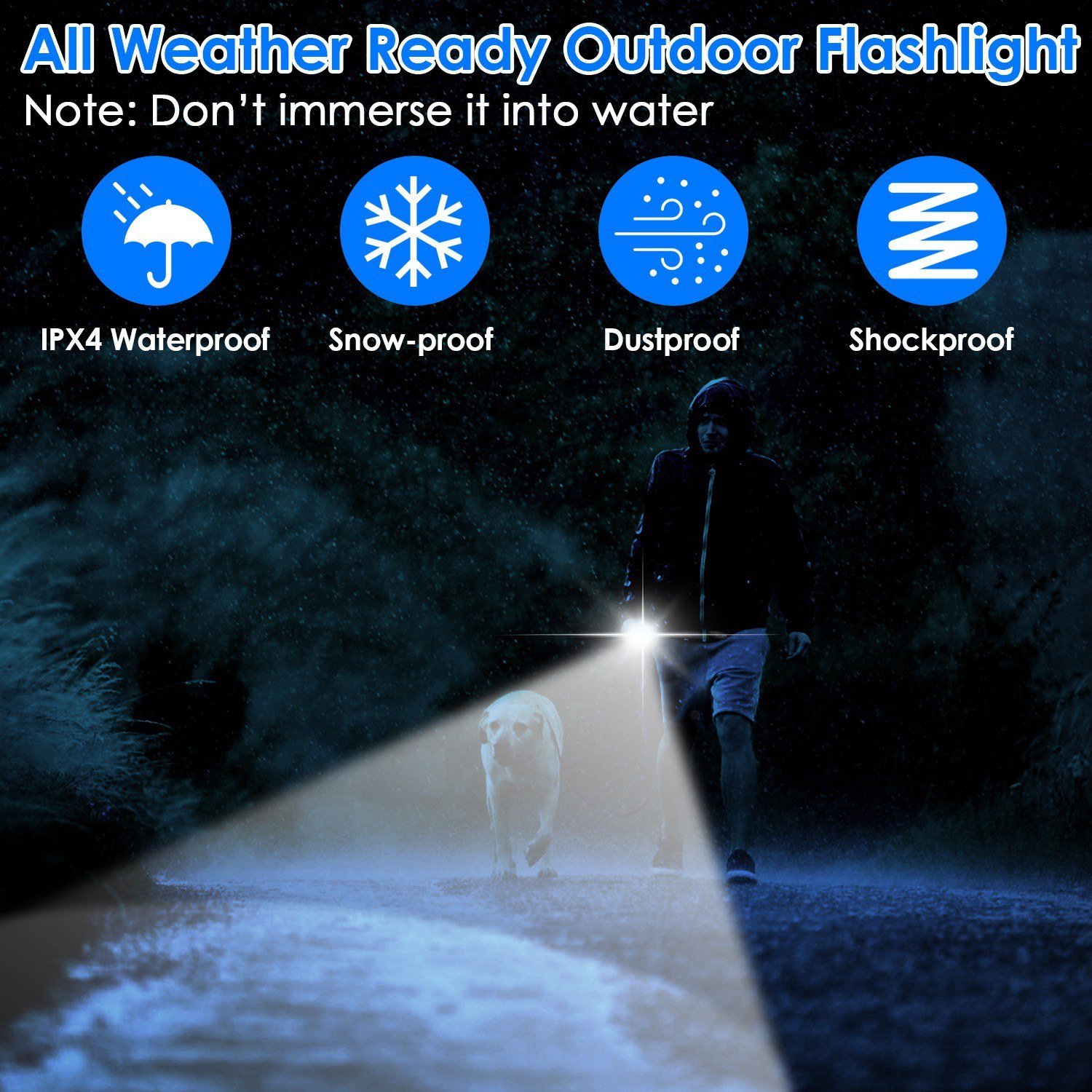 *Freely Use In Outdoor Environment*:This IPX4 waterproof flashlight can be used under rainy weather. Its environment-friendly material and clever body design makes it slip-resistant; impact resistant and portable to carry; especially suitable for outdoor use; such as night camping or hiking.