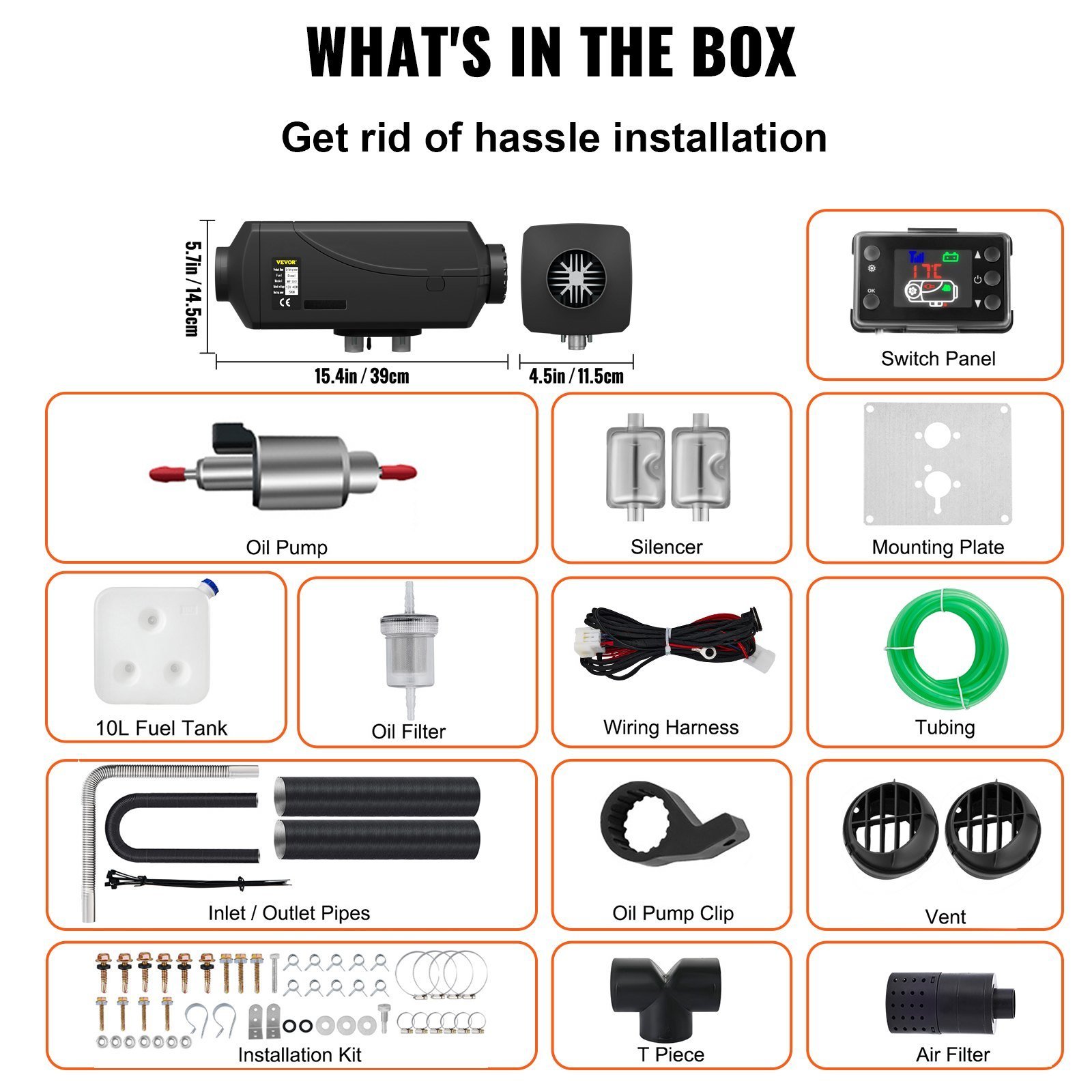 4.Effortless Installation: Complete Accessories: 1 x Oil Pump, 1 x 10L Tank, 1 x LCD Switch, 2 x Silencers, 1 x Mainline Beam, 1 x Oil Filter, 1 x Air Filter, 1 x Inlet Pipe, 1 x Exhaust Pipe, 1 x Installation Kit. The full accessories set makes it a breeze to install this parking heater in your vehicle. It can be flexibly installed in the passenger room, trunk, or under the container.