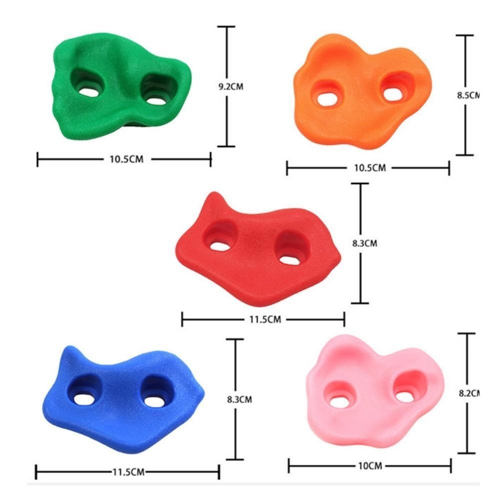 1.10pcs assorted rock climbing holds with different colors designed to add on to a climbing wall or playset. Plastic construction offers fine shoe and hand grip and works well both in outdoor and indoor environments.